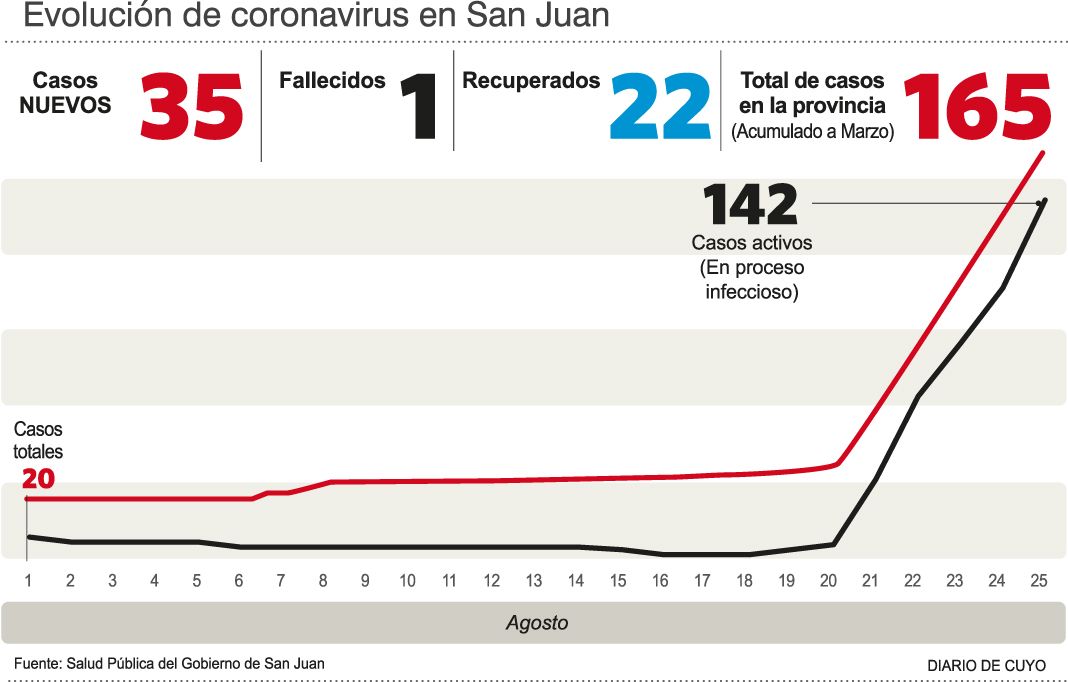 La curva de contagios sigue subiendo y San Juan superó su marca de casos en 24 horas, pues confirmó ayer 35. De esta manera, los positivos de coronavirus son 165 (un fallecido) y entre las personas afectadas aparecen los trabajadores de primera línea, como los agentes de salud y los policías. De acuerdo a las autoridades, hasta ahora son al menos nueve agentes de salud y cuatro efectivos policiales a quienes detectaron el virus, pero hay otros más que aguardan el resultado de los hisopados. A su vez, siguen siendo 15 las personas internadas, cuatro de ellas muy graves pues permanecen con respiración asistida, indicaron desde el Ministerio de Salud Pública.