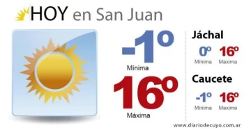 San juan, 17 de julio.- El Servicio Meteorológico Nacional anunció para este viernes una máxima de 16 grados, con vientos de direcciones variables por la mañana y del Oeste en la tarde-noche.