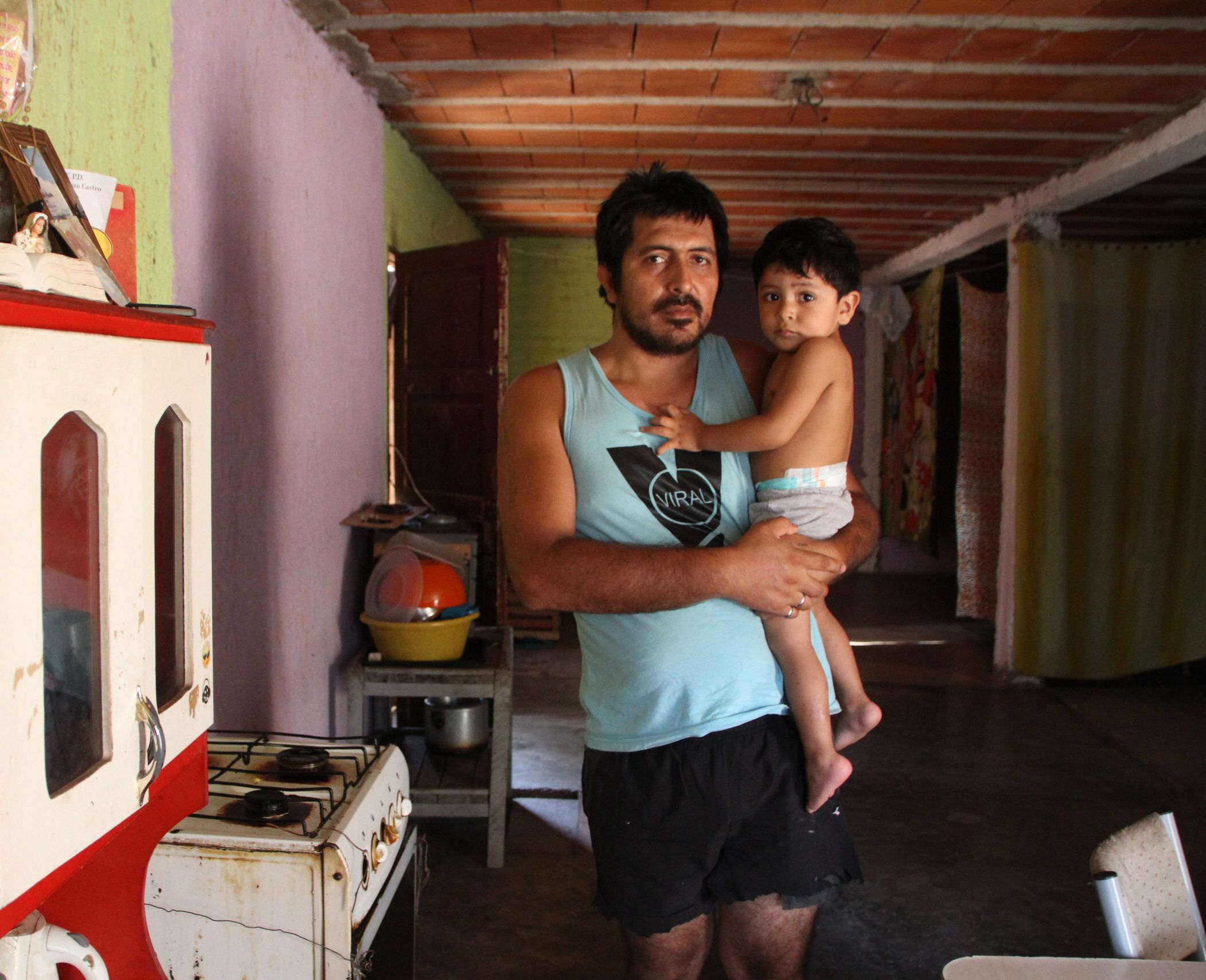 Buscando la salida. Jorge y su hijo Brandon, quien estuvo internado la semana pasada por problemas de alergia. El padre busca trabajo para no ser desalojados del salón devenido en improvisado hábitat para toda la familia, compuesta por Mariela, su pareja, y otros 4 hijos.