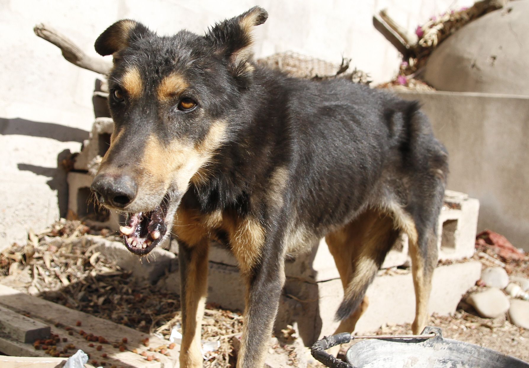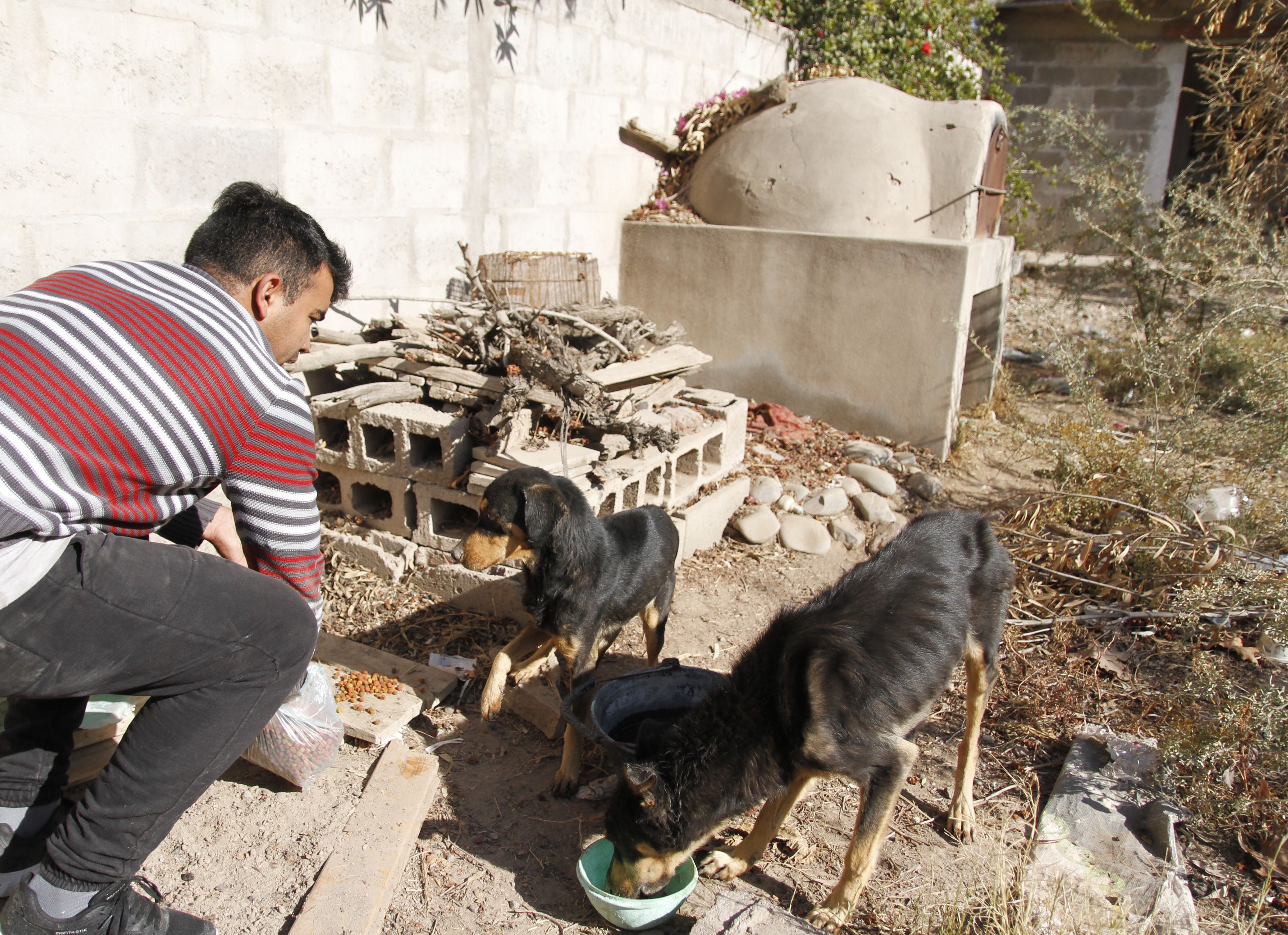 Abandonados. Los perros se acercan a los vecinos cuando les llevan comida, pero no dejan que los acaricien. Cuando alguien intenta agarrarlos se defienden ladrando.