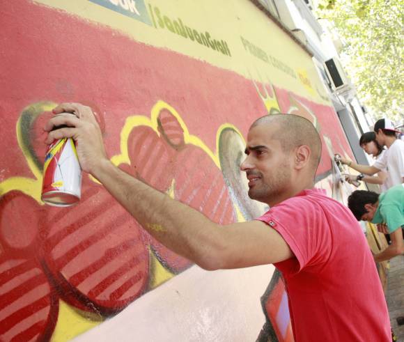 El artista Yamil Montiel, que ganó el concurso de una empresa que vende aerosoles, pintó ayer un mural en Santa Fe y Entre Ríos, que era parte del premio.