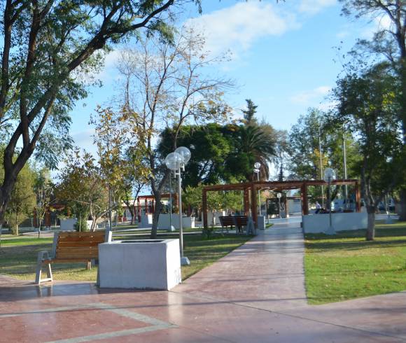 La remodelación de la plaza tuvo una inversión de $1,8 millones y el espacio verde cambió radicalmente su cara. Ahora tiene un portal de acceso, canteros y pérgolas y en el espacio central, un gran círculo con piso de porcelanato junto a un escenario, para los actos. También mejoraron el sistema de iluminación y recuperaron el riego por aspersión.
