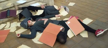 Las jóvenes simularon distintos tipos de femicidio (una de ellas aparece maniatada y con signos de violencia, mientras que la otra puede observarse con una bolsa en la cara, como si hubiera sido asfixiada) y, tiradas en el suelo rodeadas de papeles y carpetas, fueron fotografiadas en tribunales, el cruce de las peatonales y la facultad de Filosofía, donde pegaron carteles con la leyenda ‘Justicia lenta es igual a mujeres muertas’.