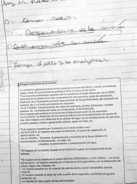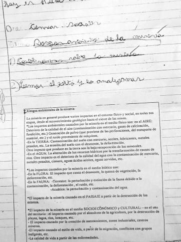 La minería en general produce varios impactos en el entorno físico y social, en todas sus etapas, desde el reconocimiento geológico hasta el cierre de las minas". Con esta afirmación comienza un texto que, como fotocopia, recibieron los chicos de 3er grado de la Escuela Normal San Martín. Es parte de Riesgos Ambientales, un tema de dictado obligatorio en el área Ciencias Sociales, pero a la vez en un discurso claramente contrapuesto al oficial, que impulsa a la minería como actividad productiva fundamental para la provincia. Entre otros, el texto enumera "la contaminación de la tierra, el aire y el agua con mercurio, metales pesados, cianuro y aguas servidas". El material en cuestión causó tanto revuelo que hasta la propia ministra de Educación, Cristina Díaz, envió a la supervisora de la zona 4, Claudia Carmona, a hablar con las docentes y la directora de la escuela, para informarse al respecto.