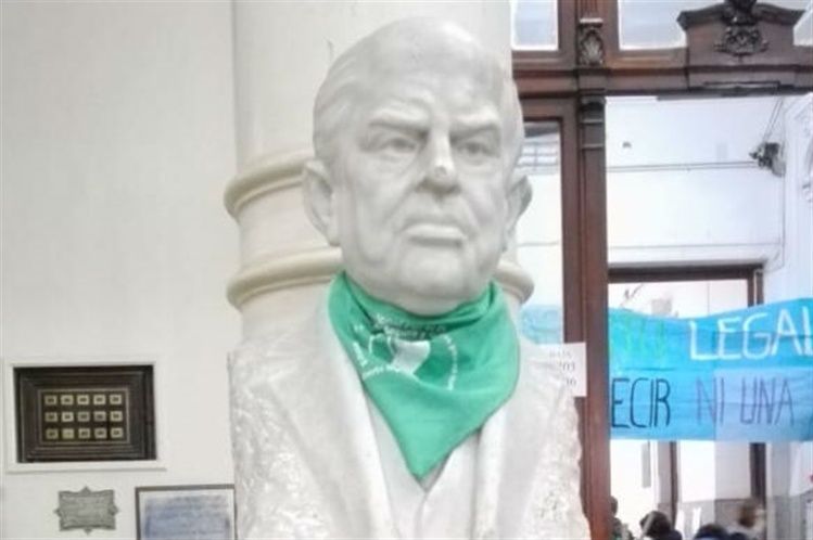 En la previa del tratamiento de la norma, una imagen similar había generado repercusiones. Se trató del busto de Domingo Faustino Sarmiento con el pañuelo que fue colocado por alumnos del colegio porteño Carlos Pellegrini.