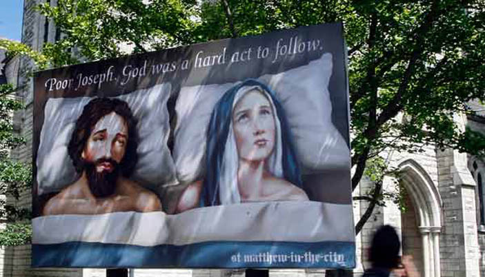 El cartel -que imita el estilo al fresco común en los murales de las iglesias- muestra a María y José tendidos en la cama. José mira hacia abajo y María, que vuelve los ojos al cielo, parece frustrada. La leyenda dice: "Pobre José, no es fácil hacerlo como Dios".