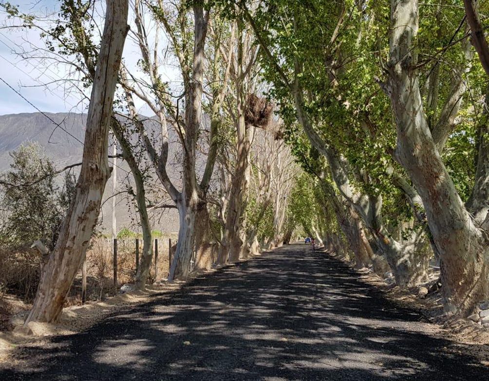 Marcados. Varios plátanos a ambos costados de calle 9 de Julio, en Zonda, están marcados con una cruz roja. Es para señalizar los que quieren podar para continuar con la obra de pavimentación.