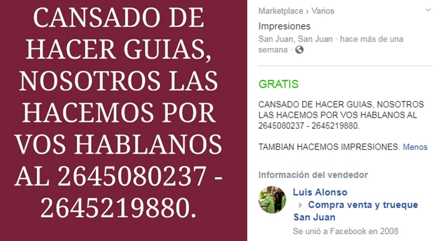 "Cansado de hacer las guías, nosotros las hacemos por vos". Esta es una de las frases con las que personas de San Juan ofrecen un servicio que generó polémica, pues cobran por resolver las tareas escolares y entregarlas listas para que el alumno sólo las transcriba a su cuaderno, sin tener que hacer ningún esfuerzo. Este servicio lo ofrecen a través de las páginas de compra y venta que hay en las redes sociales.