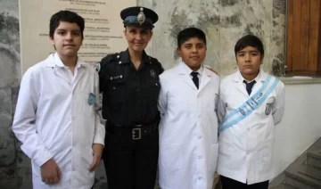 Los tres alumnos se mostraron nerviosos ante del acto. Les consultaron a sus maestras cómo debían pararse. Les dijeron que firmes igual que los efectivos de la Policía. Mantuvieron esta postura desde que comenzó el acto hasta que el mismo llegó a su fin. Sólo rompieron fila para entregarle un regalo al comisario Luis Espiñeira Rodríguez, jefe de la Delegación San Juan. Le regalaron un vino para agradecerle el apadrinazgo.