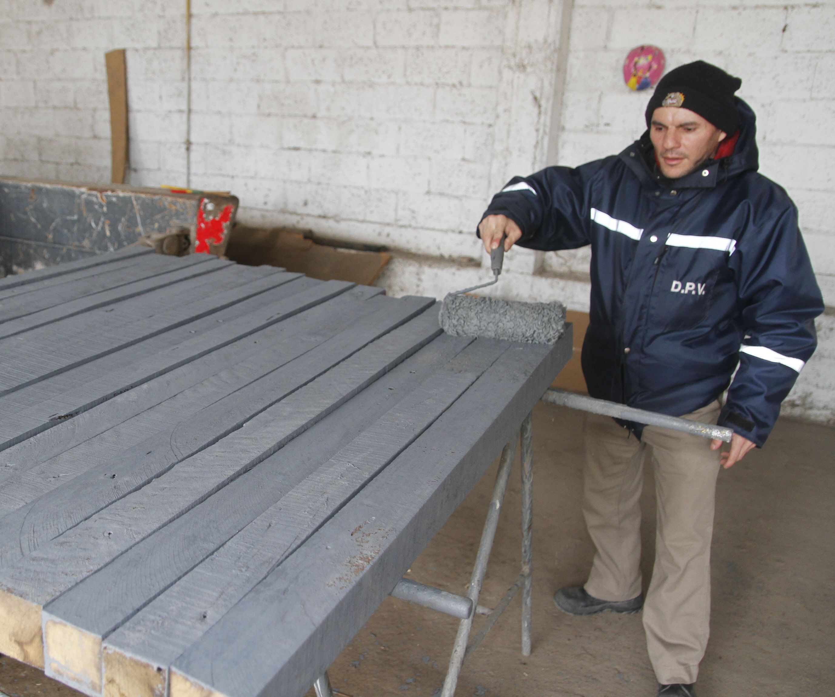 Pintura. Los operarios se encargan de pintar con pintura antihumedad, antióxido y de color gris opaco los postes de madera de laurel y la chapa galvanizada con los que se fabricarán los carteles. Luego, ambos materiales se agujerean para la colocación de los tornillos.