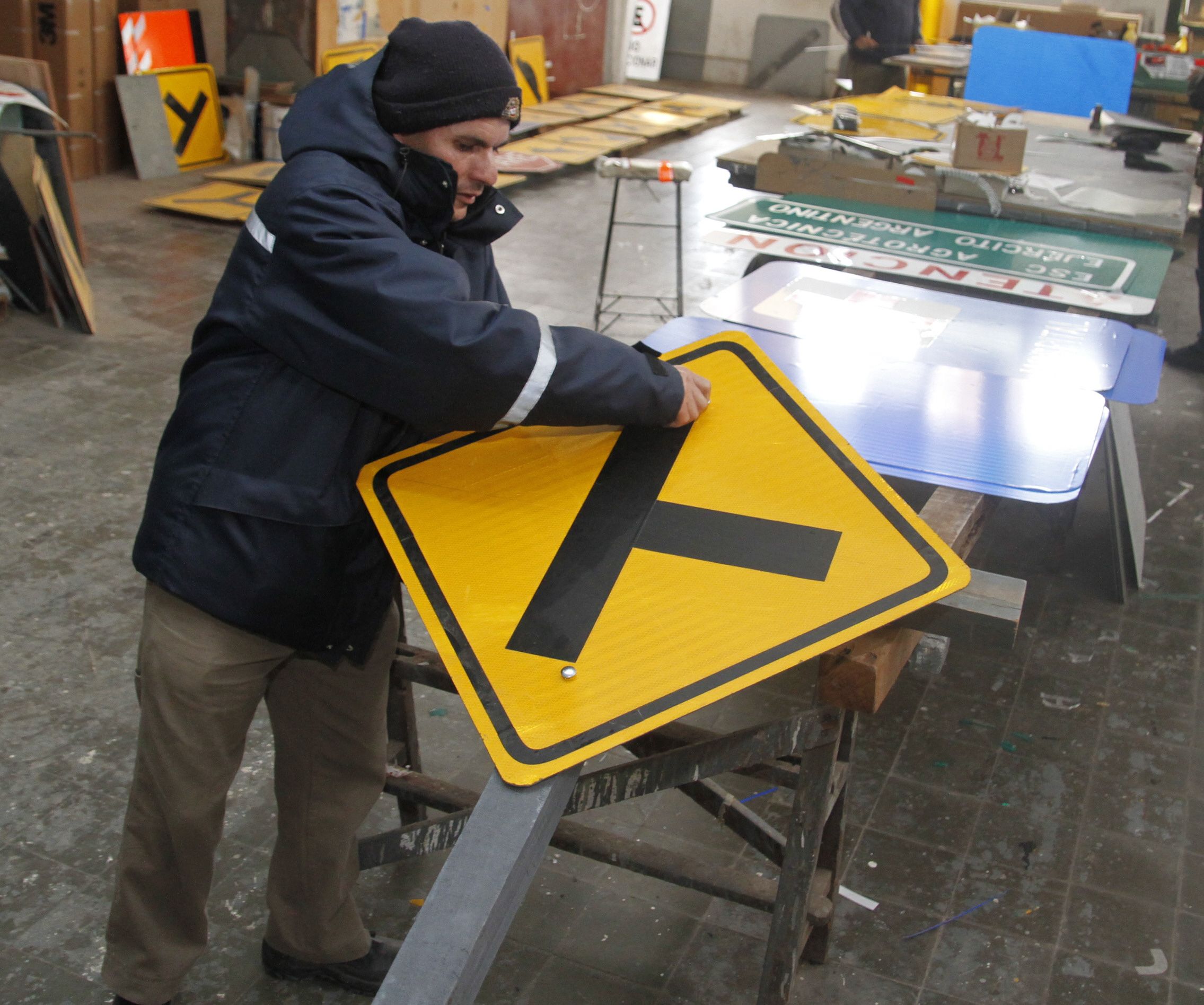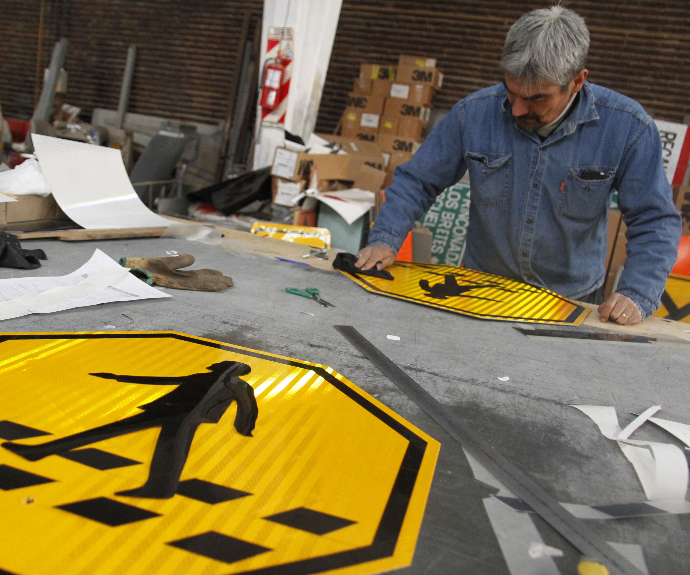 La Dirección Provincial de Vialidad cuenta con su propio taller de fabricación de carteles viales. Allí se reciben los materiales en bruto que se compran mediante licitación para luego fabricar la cartelería que debe cumplir con determinados requisitos y características. "Para hacer los elementos de señalización vertical que son los carteles, se usa chapa galvanizada y postes de madera de laurel, ya que ambos materiales son resistentes a las inclemencias del tiempo, especialmente a los vientos. También se usa papel reflectivo con características especiales de refractancia y durabilidad", dijo Pedro Bruna, de la Sección Señalamiento Vial. Agregó que al mes fabrican en promedio 100 carteles para reponer en las rutas, y que la tarea de instalación también la realiza personal de esta repartición. Bruna explicó que el proceso de fabricación de los carteles viales se realiza en cuatro pasos básicos.