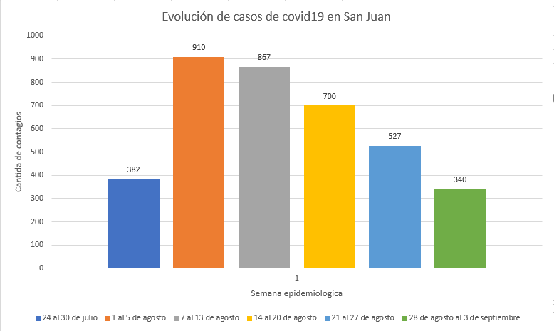 Por cuarta semana consecutiva se registró en San Juan descenso en la cantidad de nuevos contagios de coronavirus, según el reporte que publica los martes el Ministerio de Salud Pública de San Juan. En la semana epidemiológica Nº35 (28 de agosto al 3 de septiembre) se reportaron 340 casos.