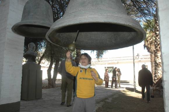 Antes de que Gabriel terminara el circuito, Leticia, la otra guía, se preparó para recorrer el lugar con otro contingente. Esta vez, un grupo de abuelos y nietos, también llegados desde Mendoza, que demostraron un interés que trascendió lo meramente histórico. Mientras los hombres se detuvieron para comprobar la resistencia y detalles de los grandes ventanales de la celda, los más chicos se quedaron en el patio, empecinados en mover alguna de las dos campanas que pesan cuatro toneladas.