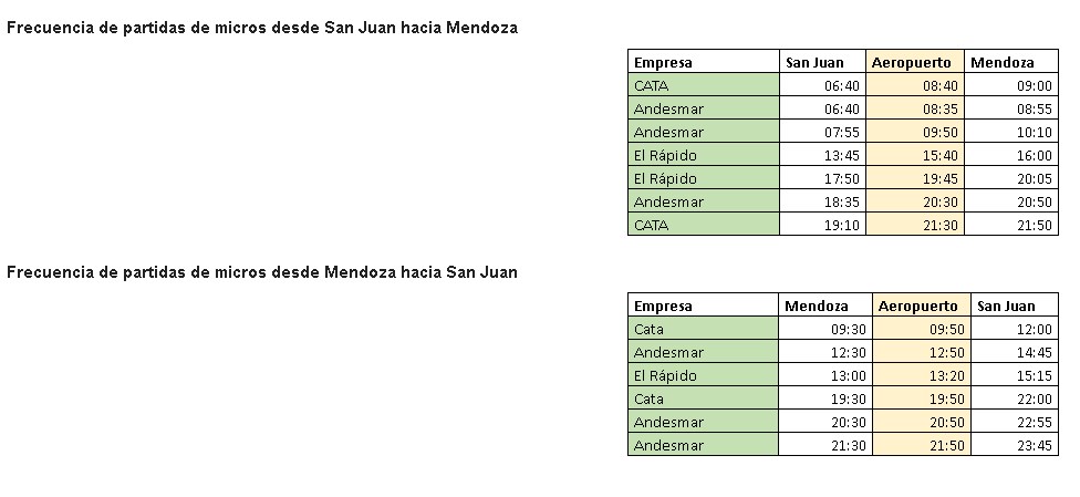 Cata ofrecerá un 20% de descuento; Andesmar y El Rápido brindarán un 10% de descuento en su tarifa habitual. Los micros saldrán desde la Terminal de Ómnibus de San Juan capital hacia el aeropuerto mendocino en los diferentes horarios de su grilla. Los pasajeros que deban tomar un vuelo en horarios por fuera de ellas, dispondrán de un servicio chárter de la empresa Andesmar que saldrá desde la terminal de micros de San Juan, a las 4 de la mañana.