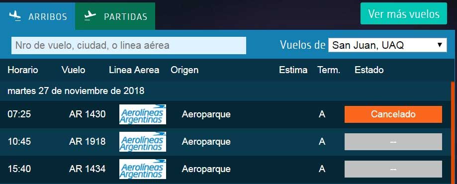 A las 7:25 debía llegar el avión de Aerolíneas  desde Aeroparque  pero nunca despegó por lo que el primer servicio de San Juan a Buenos Aires tampoco se cumplió.