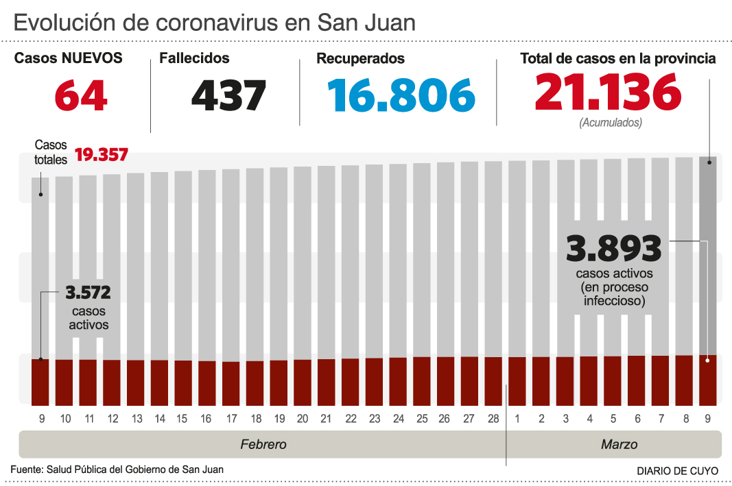 De acuerdo al parte diario del Ministerio de Salud Pública, ayer había sólo cuatro personas con asistencia respiratoria mecánica, de un total de 21 personas internadas en áreas críticas. Se trata de uno de los números más bajos desde el último trimestre de 2020. A su vez, subió la cantidad de nuevos casos detectados pues ayer hubo 64, por lo tanto el acumulado de contagios es de 21.136.