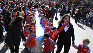 A pesar de la presencia del Sol, ni bien comenzaron a llegar con sus guardapolvos blancos sintieron el mal clima. Se los vio con camperas, bufandas, guantes y algún que otro gorro. Sin embargo, a la hora de iniciar la marcha, los chicos se sacaron todo e hicieron frente a la situación.