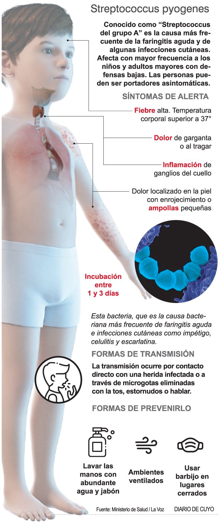Mónica Jofré, jefa de Epidemiología de Salud Pública, explicó que el ser humano es portador de estreptococos del grupo A que son bacterias que suelen estar presentes en la garganta y en la piel y que, normalmente, provocan enfermedades leves como angina y faringitis. Pero también otras más graves que pueden causar la muerte. Agregó que esto ocurre cuando la bacteria ingresa al organismo e invade distintas partes como la sangre y los músculos. "La persona es el reservorio de esta bacteria y puede portarla de manera asintomática. La gravedad se da cuando genera una enfermedad invasiva como la meningitis, neumonía, celulitis o un shock séptico que es una infección generalizada en todo el cuerpo. Lo importante es que esta bacteria se puede eliminar y salvarle la vida al paciente", sostuvo Jofré.