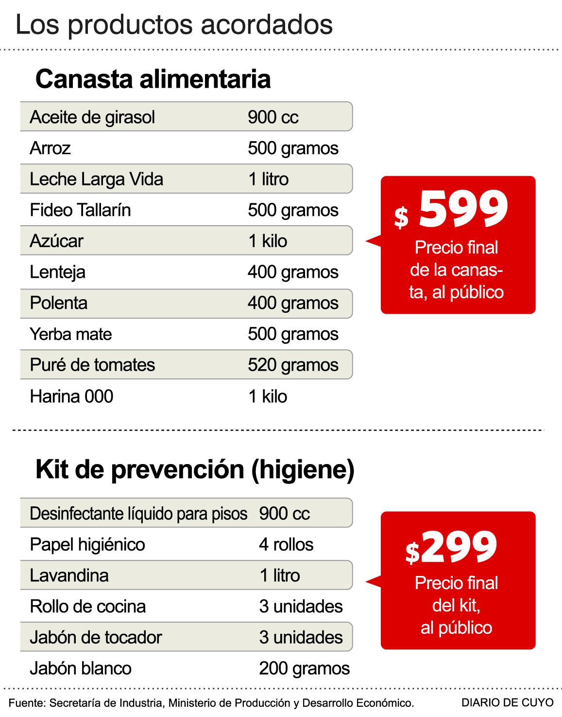 La intención oficial es favorecer a las familias sanjuaninas en medio de la crisis ocasionada por la pandemia y atendiendo a los buenos resultados de los meses anteriores, desde hoy está disponible un nuevo acuerdo de precios con las cadenas de supermercados locales y mercados de barrio, que totalizan 28 bocas de expendio. Se trata de dos tipos de canastas muy económicas, de 599 pesos y de 299 pesos respectivamente, con un total de 16 productos entre alimentos de primera necesidad y de higiene y prevención.Tanto el kit de limpieza como el combo de alimentos (ver infografía) se podrán comprar juntos o separados hasta el 30 de junio. La novedad este mes es que el de los comestibles, incluso, se podrá adquirir con la tarjeta AlimentAr.