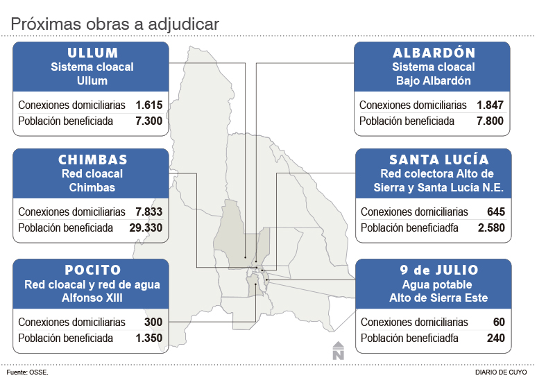 El 31 de este mes se finalizará la apertura de sobres, y entre el 2 y 16 de junio próximo todas quedarán adjudicadas y con un plazo de ejecución de entre 12 y 24 meses. De esta manera, en 2 años, pasarán de 10 a 17 los departamentos con este servicio con el que ya cuentan el Gran San Juan, Pocito, Caucete, Angaco, Albardón y Sarmiento. Ullum también, que no cuenta con cloacas en ningún distrito, está contemplado en el Programa Hábitat II, pero recién los sobres de licitación se abrirán a fines de este mes, por lo que aún se desconoce cuándo comenzará y finalizará la obra.