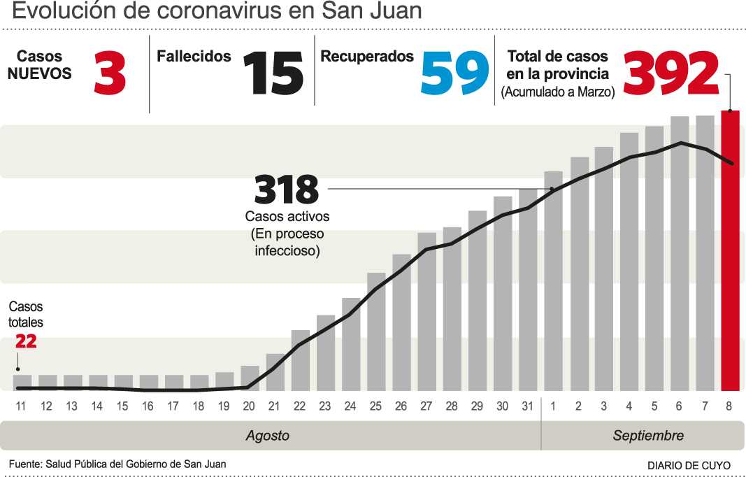 Por otro lado, del total de 392 casos confirmados, hay 318 con proceso infeccioso en curso; a la vez que la única noticia positiva del día fue que 22 sanjuaninos, quienes cumplían aislamiento domiciliario y en hoteles, pasaron a integrar la columna de recuperados, que ya totalizan 59.