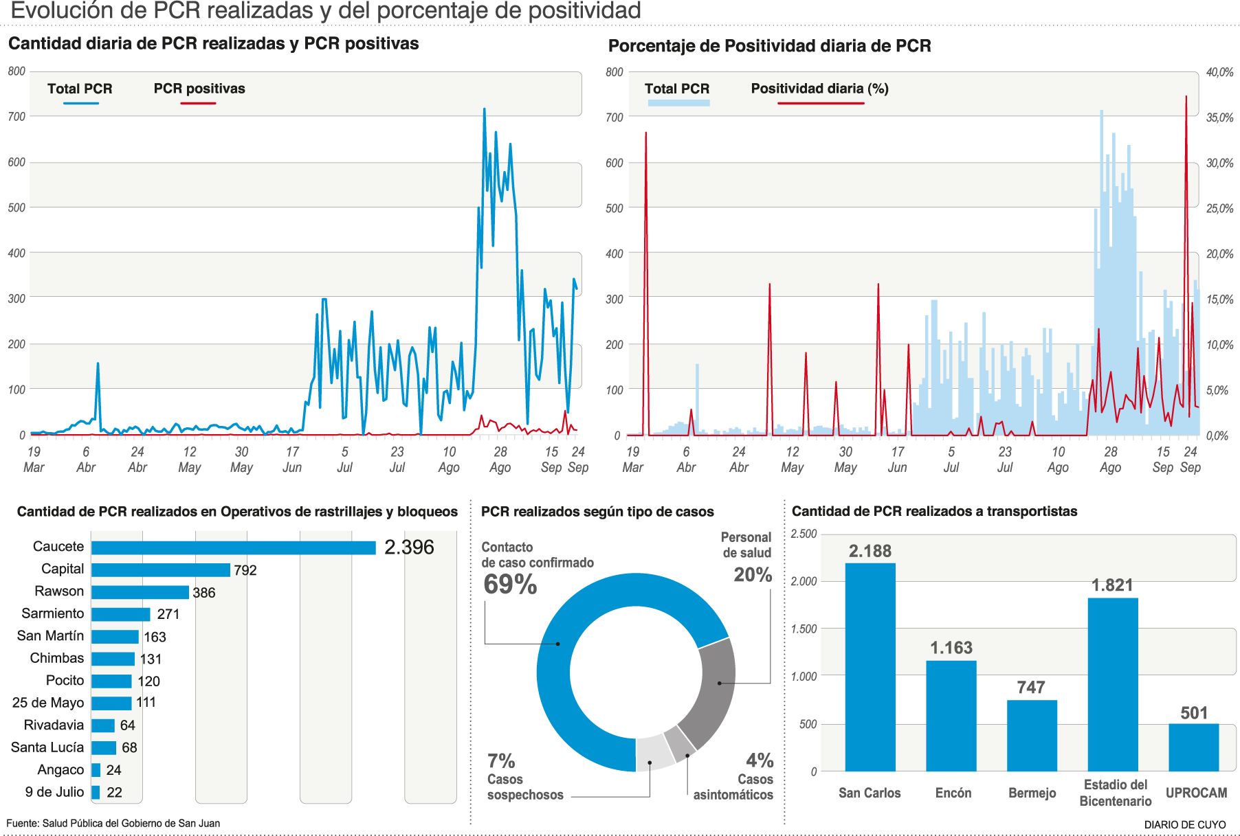 De acuerdo a las cifras oficiales, hasta el 24 de septiembre el Ministerio de Salud Pública local realizó 27.138 PCR entre casos sospechosos, asintomáticos, personal de salud y contactos de confirmados; y de ello se desprende que la positividad es del 2,4% (ver infografía).