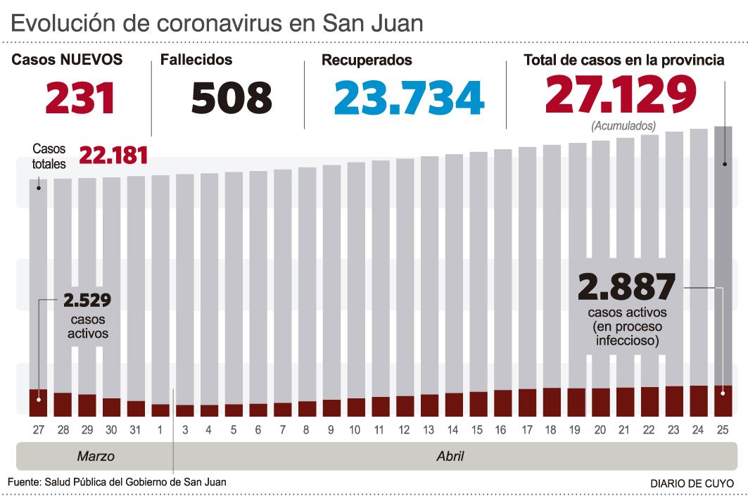 El Ministerio de Salud Pública informó que ayer se detectaron 231 casos de coronavirus en San Juan y hubo 4 víctimas fatales, en 24 horas. Con este número, el total de contagios se elevó a 27.129 mientras que el de muertos llegó a 508. La cantidad es alta teniendo en cuenta que los fines de semana disminuye.