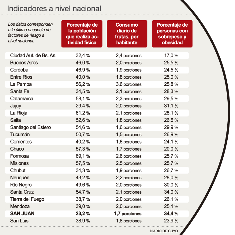En la 4ta edición de la Encuesta Nacional de Factores de Riesgo salió a la luz que 4 de cada 10 personas en el país no realizan actividad física. A eso hay que sumarle que en la Argentina, los cambios en las prácticas alimentarias siguen la tendencia mundial y el consumo de frutas y verduras disminuyó mientras que el consumo de jugos y gaseosas aumentó. Y si bien la provincia no se encuentra entre las que tienen mayores problemas (ver infografía), en Salud la situación actual preocupa porque puede hacer que los números se disparen. "En este momento, lo que más nos preocupa es el sedentarismo que puede conducir a la obesidad o el sobrepeso. Los chicos y los adultos se mantienen mucho tiempo quietos dentro de sus casas", dijo la especialista al comenzar la charla. Sobre los problemas de sobrepeso, dijo que además de preocupar el sedentarismo, los mantiene en alerta la elección de los alimentos. Sobre todo teniendo en cuenta que es muy posible que debido al encierro se genere ansiedad y eso lleve a que las personas coman en mayor cantidad.