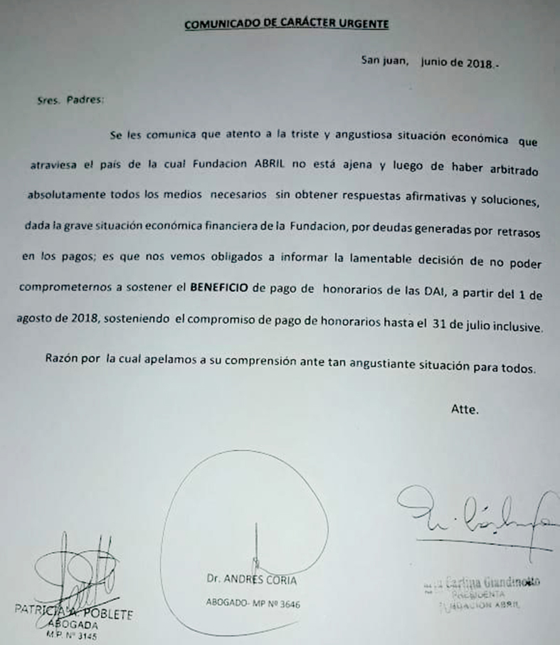 Una de las instituciones es la Fundación Abril, quien admitió en una nota dirigida a los padres que dada la grave situación económica financiera de la Fundación no se compromete a pagar los honorarios de las DAI a partir del 1 de agosto (ver facsímil).