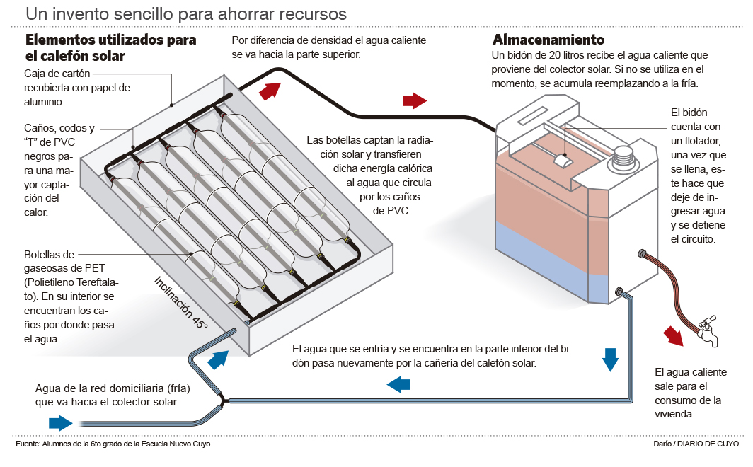La mayoría de los alumnos no tiene gas natural en su casa. Sus papás hacen changas o viven de los planes sociales. Asisten a una de las escuelas más carenciadas de la provincia y muchos, gracias a la comida que les sirven ahí, no pasan hambre. A pesar de todas estas dificultades y superando varios obstáculos sociales los chicos se volvieron inventores y ahora sueñan con ayudar a sus familias. Los alumnos de 6to grado de la escuela Nuevo Cuyo, de La Bebida, fabricaron paneles y calefones solares con botellas plásticas y otros elementos reciclados. Ganaron la Feria de Ciencia Zonal y ahora competirán en la Provincial. "Un día llegaron muy preocupados por la crisis económica y por las facturas de la luz. De hecho muchos contaron que les habían cortado ese servicio y ya no tenían de dónde sacar agua caliente para bañarse", dijo Rita Ascuy, una de las docentes que comentó cómo surgió este proyecto.