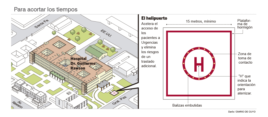 La construcción del primer helipuerto sanitario en la provincia ya es un hecho. Así lo adelantó el secretario de Obras Públicas, Jorge Deiana, quien agregó que el mismo estará adentro del predio del Hospital Guillermo Rawson. Según el funcionario, esta obra quedará inaugurada antes de que finalice el 2018. Se trata, además, del primer lugar en San Juan destinado exclusivamente al aterrizaje y despegue de helicópteros.