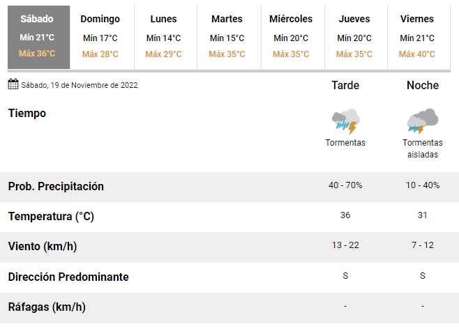 Para la noche de este sábado, luego de una jornada calurosa, el Servicio Meteorológico Nacional ha pronosticado tormentas con viento del sur que provocará un descenso de la temperatura que tuvo una máxima de 35°C.