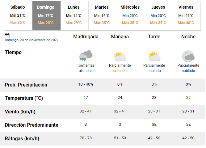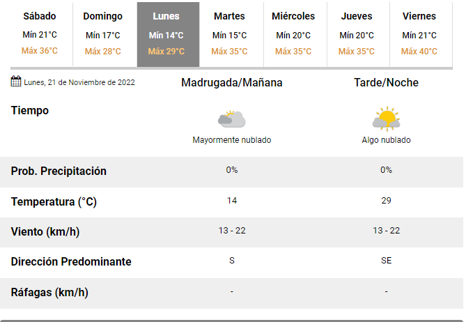 El lunes, tras un día agitado, proporcionará calma ambiental mientras que las brisas del sur en la mañana y sudeste por la tarde-noche, provocarán que la máxima ascienda hasta los 29°C. El cielo estará de mayor a algo nublado. Finalmente, desde el martes hasta el viernes la temperatura irá en ascenso, rondando entre los 35 y 40 grados las máximas.