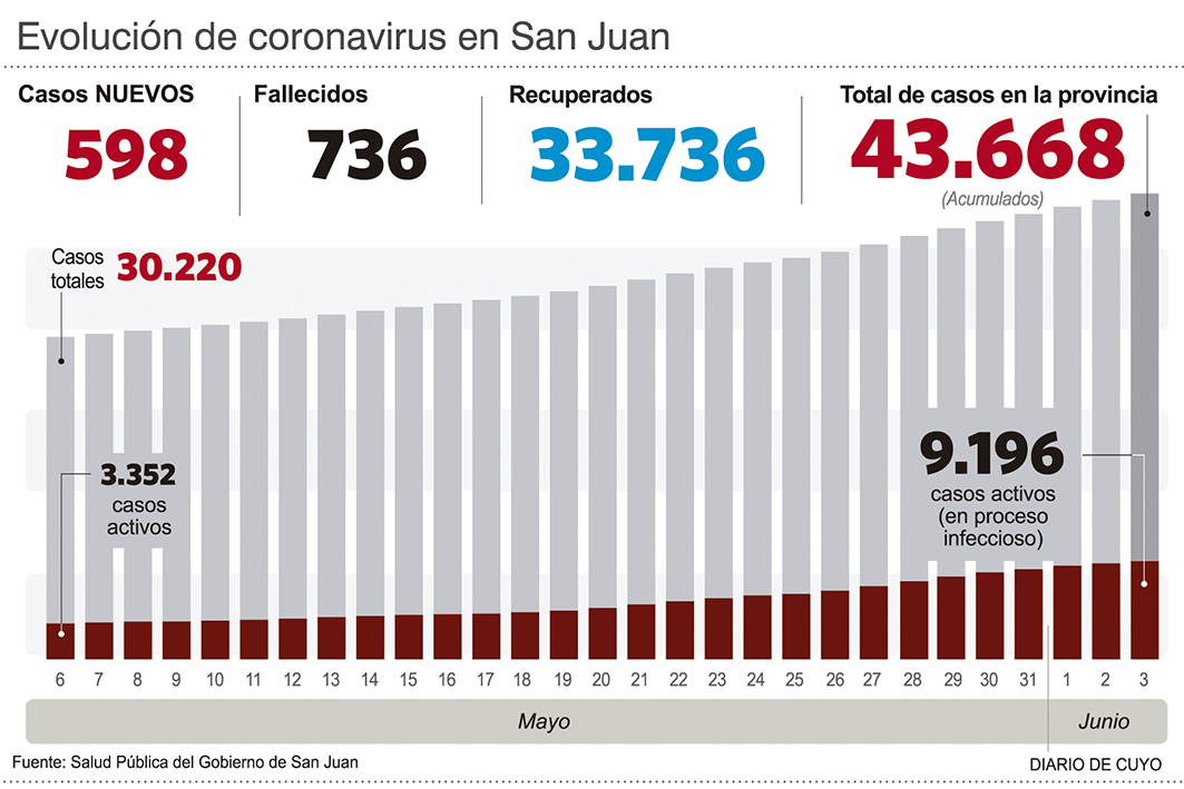 Las personas cuya muerte por covid fueron informadas ayer son una mujer sarmientina de 87 años y dos hombres de 74 y 69 años, de Caucete y Albardón respectivamente. En cuanto a los contagios, en las últimas horas fueron reportados 598, lo cual acumula un total de 43.668. Por otro lado, ayer permanecían internados 309 pacientes, 134 de ellos en Área Crítica y, dentro de ese grupo, 70 tenían asistencia respiratoria mecánica.