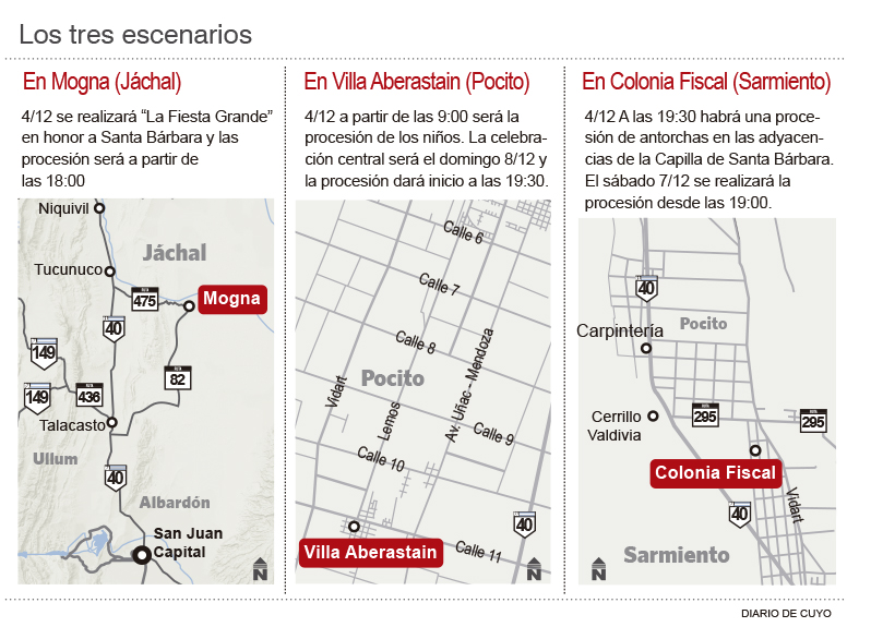 El tercer escenario de los festejos religiosos es Sarmiento. En la Capilla de Santa Bárbara, de Colonia Fiscal, habrá varias actividades en honor a la santa. Mañana será la procesión de antorchas a las 19.30, mientras que el sábado habrá una procesión, misa y un festival artístico, desde las 19, en el patio de la capilla de este distrito.