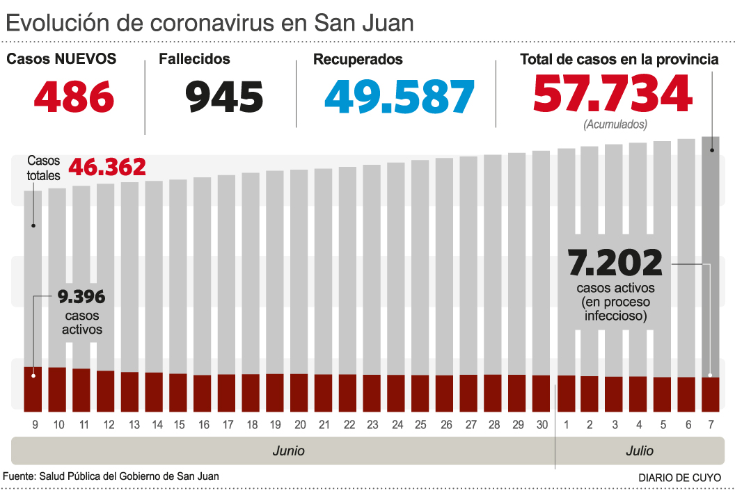 De acuerdo al parte diario de Salud Pública, ayer hubo un leve aumento de casos en la provincia. Y es que fueron reportados 486 (en la víspera habían sido 460), para elevar el acumulado a 57.734 infectados durante la pandemia.