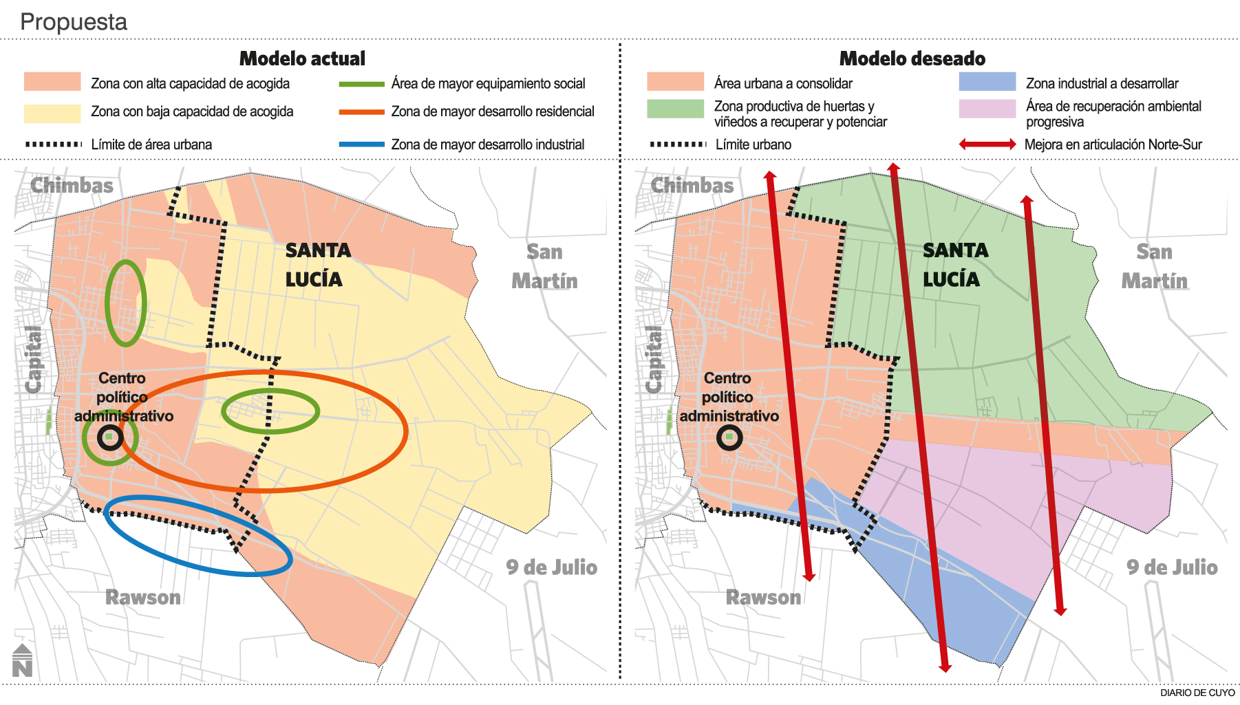 Basándose en un estudio realizado en la Universidad Nacional de San Juan y tomando referencias del Plan Estratégico San Juan 2030, se presentó un plan de ordenamiento territorial para el departamento Santa Lucía (ver infografía), que define objetivos para cuatro áreas definidas en la zona: la urbana, la productiva, la industrial y la de recuperación ambiental progresiva.