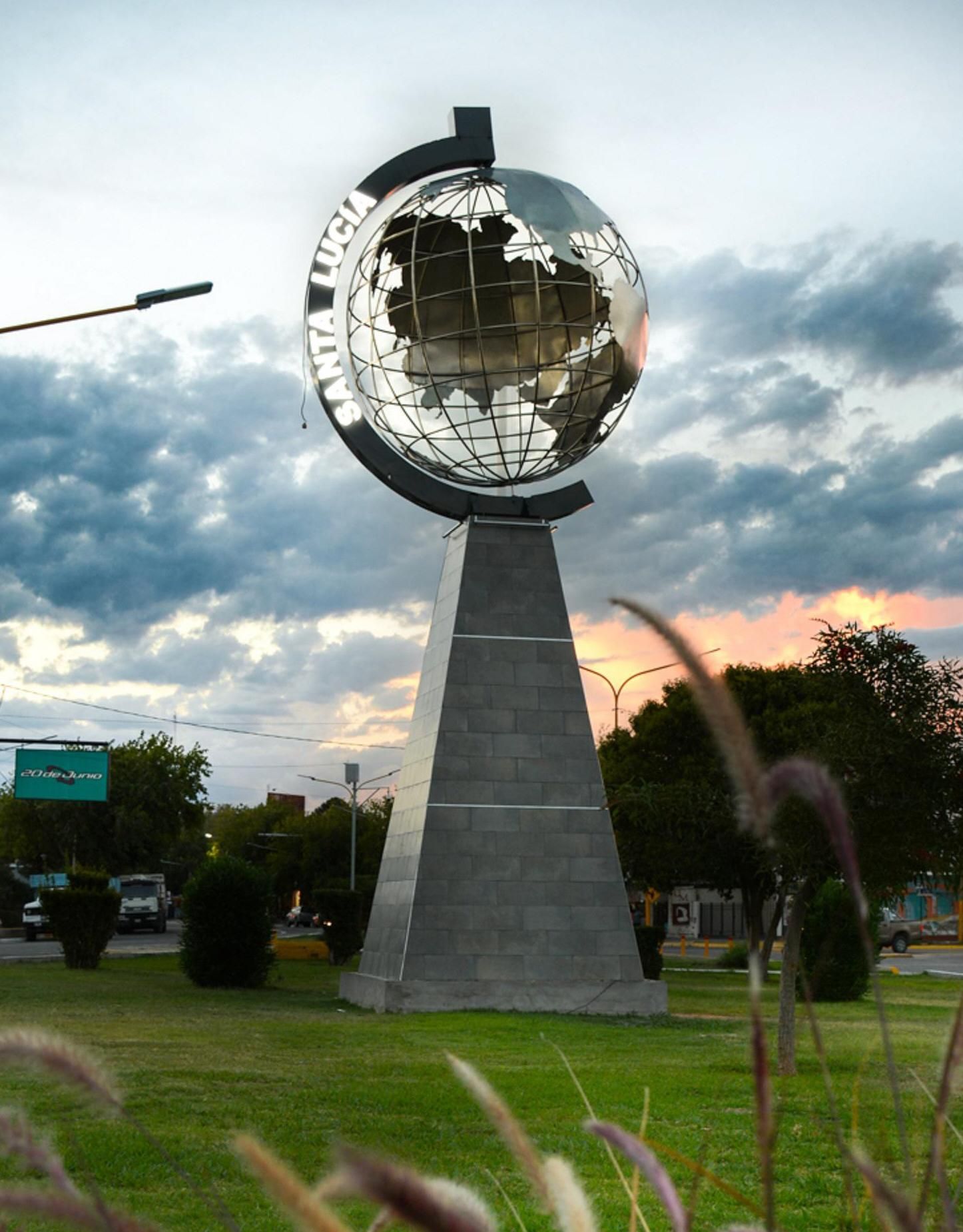 Esta obra de arte a la que bautizaron “Santa Lucía, nuestro lugar en el mundo”, empezó a gestarse hace un año y forma parte del circuito de esculturas y de hitos que viene construyendo la Municipalidad de Santa Lucía, tales como el Portal de Santa Lucía, la Esquina del Sauce y El Puente Rufino. Ahora se viene La Luz del Mundo, según dijo el intendente Marcelo Orrego. “Buscamos que este mundo sea la primera y la última imagen que se lleva quien visita el departamento. Es por eso que está puesta en lo que fue un ingreso tradicional a Santa Lucía”, dijo Orrego.