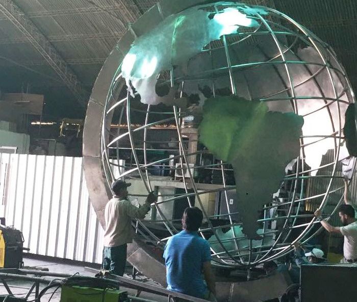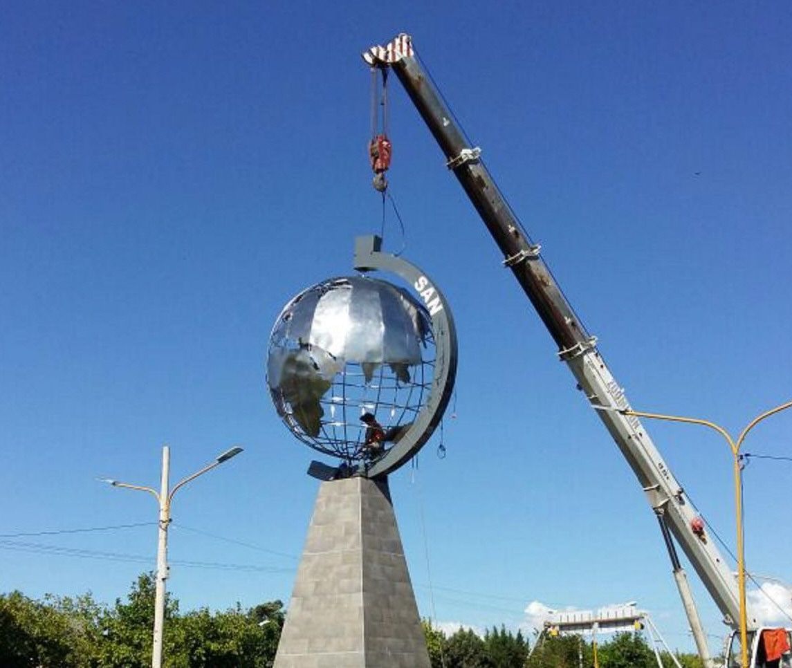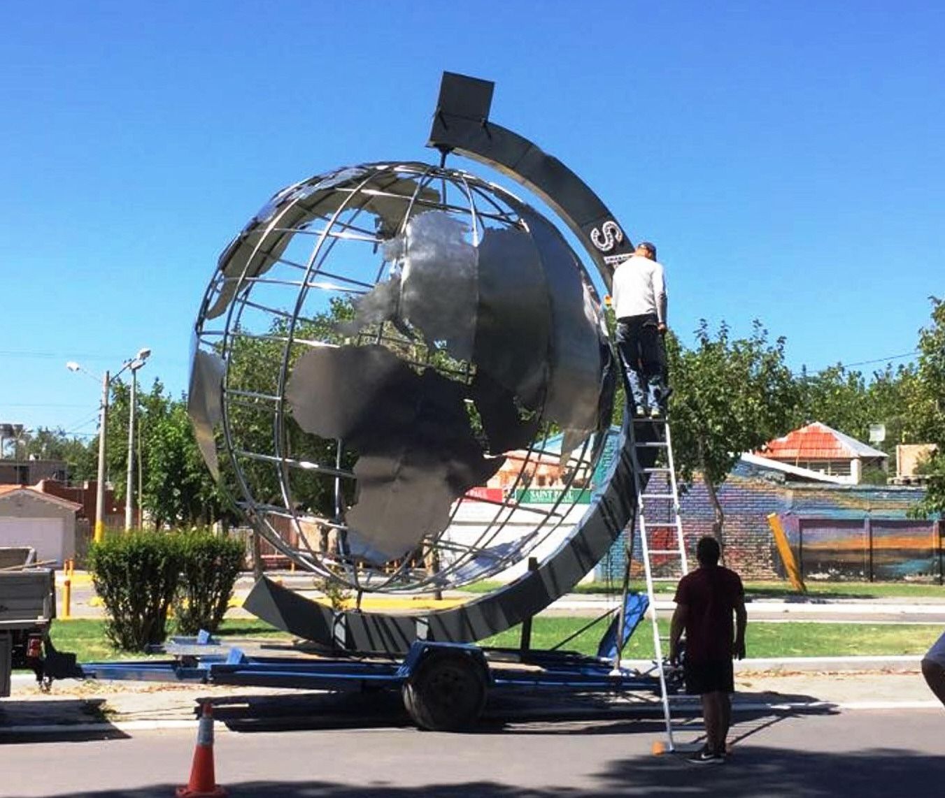 Imponente. Así es el mundo gigante construido de acero que acaban de colocar en calle Hipólito Yrigoyen y Colón. Uno de los ingresos clave al departamento Santa Lucía. La obra de arte, que está montada en una pirámide de 5 metros de altura, fue construida por un diseñador industrial sanjuanino y busca llamar la atención de quienes ingresen al departamento por esa arteria, tal como sucede con el Portal que construyeron hace un año.