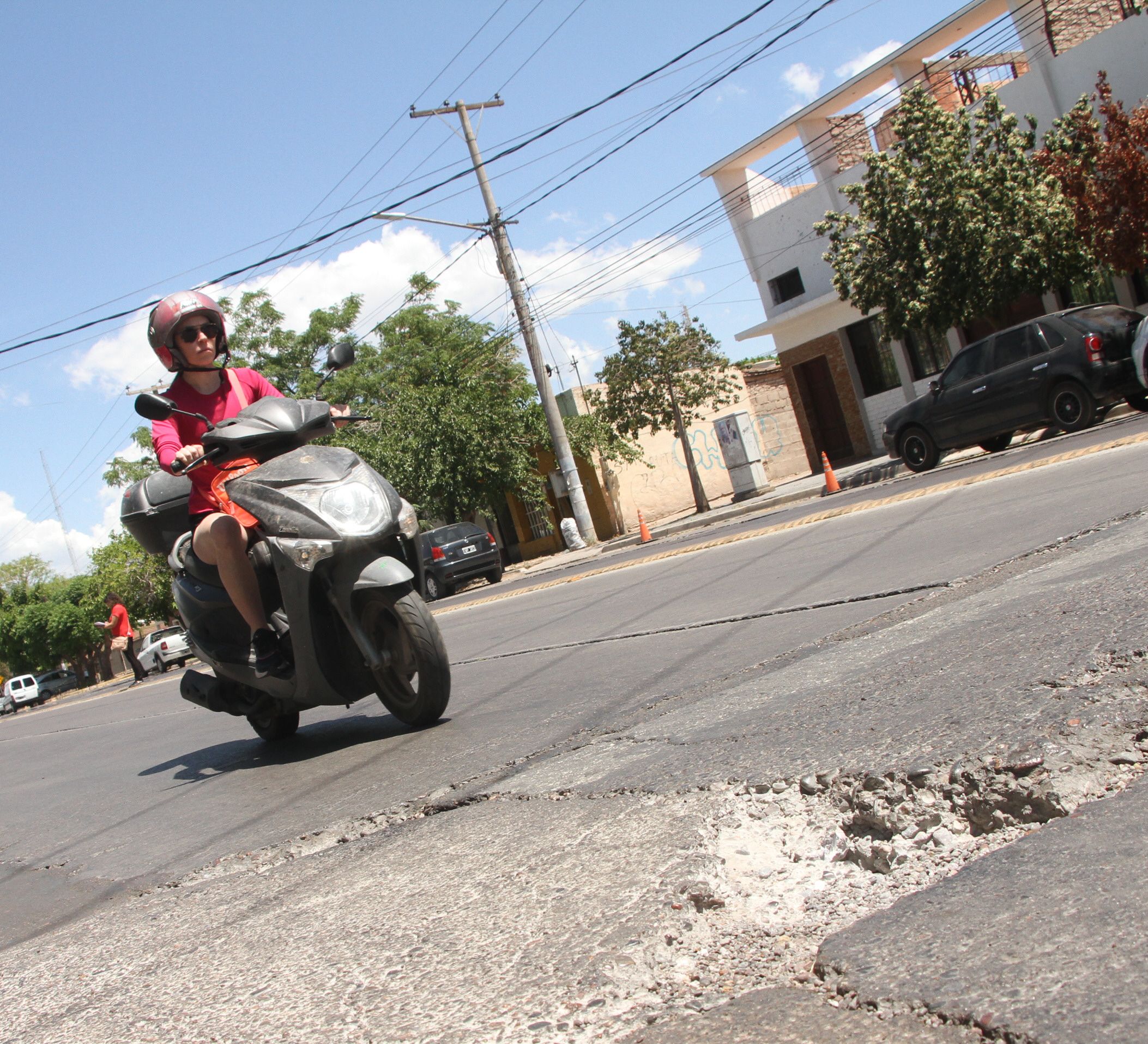 Más riesgo. Conductores de motos y bicicletas están más expuestos a caídas por las roturas del pavimento en calle Mendoza entre Líbano y El Cano.