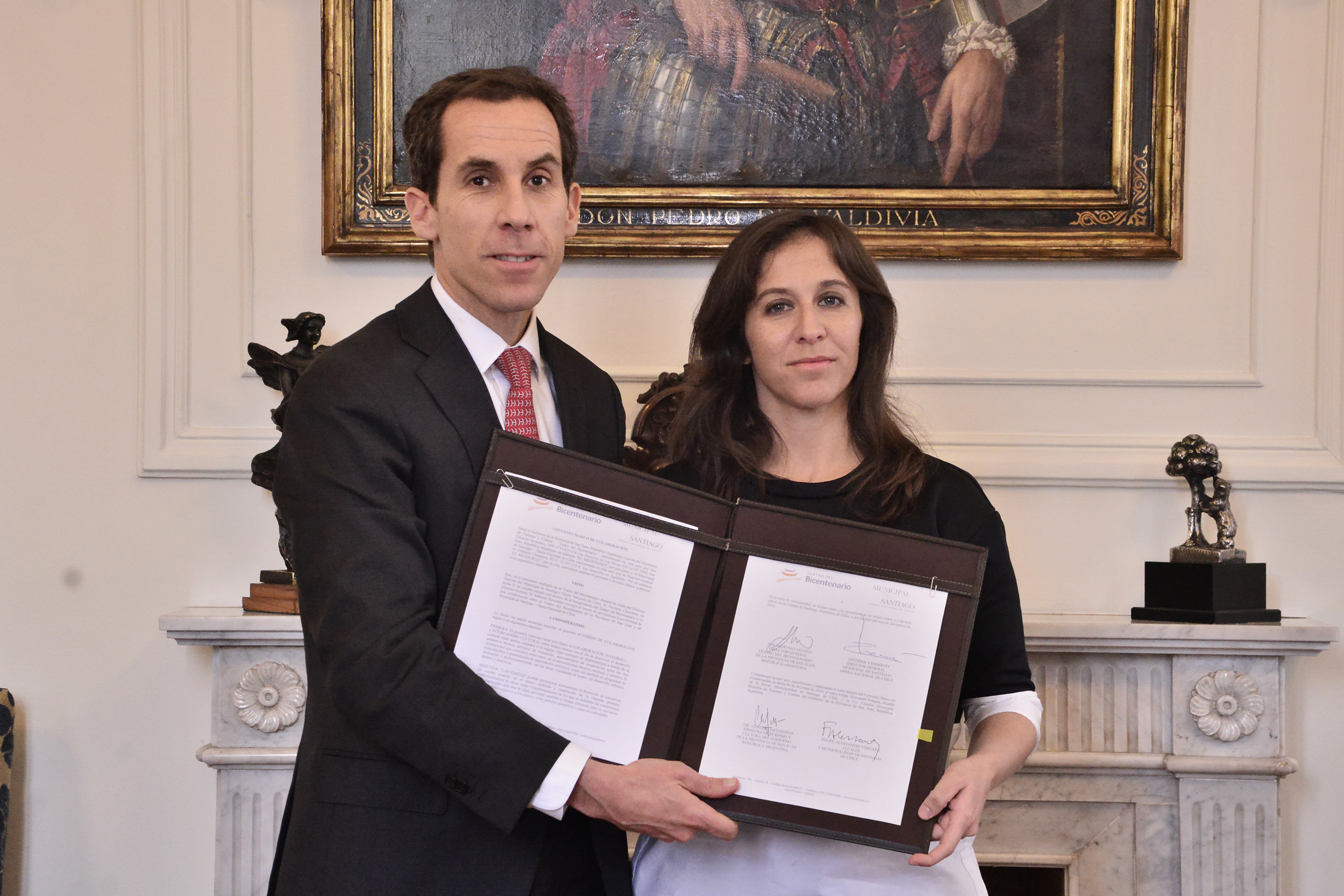 En la mañana de hoy se desarrolló en Chile, la ratificación del convenio de colaboración del Teatro del Bicentenario con el Teatro Municipal de Santiago. La firma se concretó en la Alcaidía de Santiago de Chile con la presencia de la ministra de Turismo y Cultura, Claudia Grynszpan; el director del Teatro del Bicentenario, Eduardo Savastano; junto al alcalde de la ciudad de Santiago, Felipe Alessandri; el director General del Teatro Municipal de Santiago, Frederic Chambert y las principales autoridades chilenas y la comitiva sanjuanina.