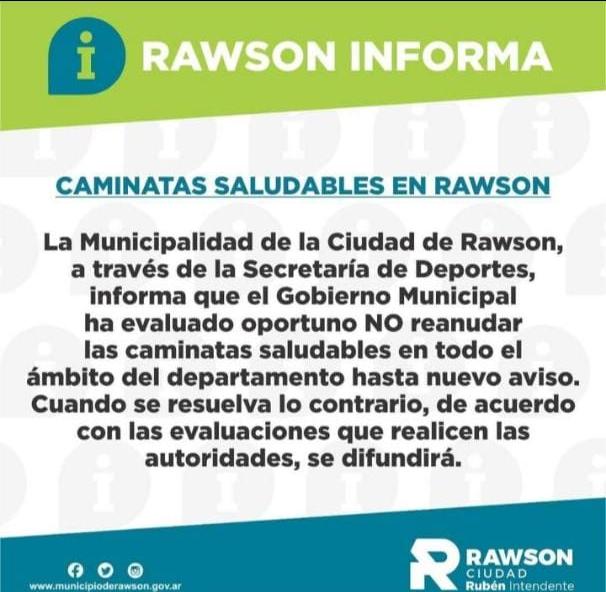 Como estaba previsto, este sábado se puso en marcha en San Juan la Fase 3 de aislamiento social, preventivo y obligatorio en el contexto de la pandemia por coronavirus. En el marco de la nueva etapa establecida por el Gobierno de la provincia, una de las actividades rehabilitadas son las Caminatas Saludables. Sin embargo, las autoridades de la Municipalidad de Rawson decidieron no adherir a la norma, por lo que la actividad no se puede desarrollar en el departamento.