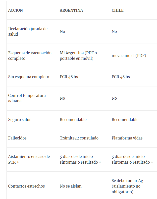 Se lleva a conocimiento que a partir del día 1° de octubre los requisitos de ingreso a Chile según su Plan de Fronteras Protegidas son:
