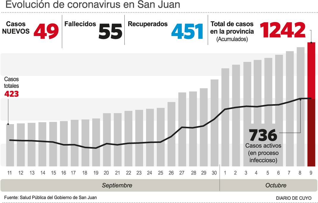 Por otro lado, hubo un salto en los casos de Covid y ayer Salud Pública informó 49 nuevas confirmaciones, que elevan el total a 1.242. De ellas, hay 736 pacientes con proceso infeccioso y 89 internados, de los cuales 28 están en áreas críticas (17 con respirador). Los recuperados ahora son 451.