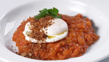 Cortar tomates en trozos irregulares y colocarlos en una sartén grande. Agregar pimientos en tiras, cebollas en trozos y pan rallado. Luego cascar un huevo por comensal y servir bien caliente.