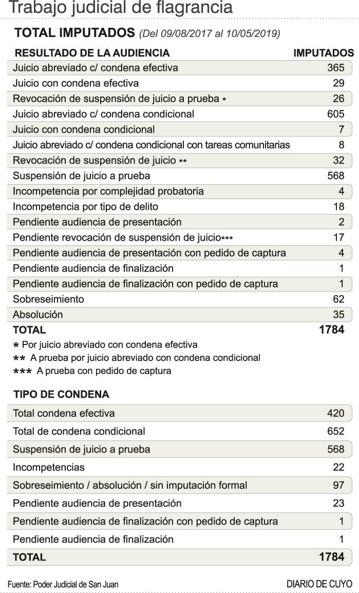 "El dato nos llamó la atención. Sabíamos que eran varias condenas, pero sorprendió la cifra. Esto significa que se ahorra tiempo, recursos humanos y mucho más. La mayoría de los casos se resuelven en las primeras veinticuatro horas", indicó el funcionario. Estas veloces resoluciones se producen por el acuerdo que surgen entre el fiscal y la defensa del acusado, que es homologado por el juez en la misma audiencia.