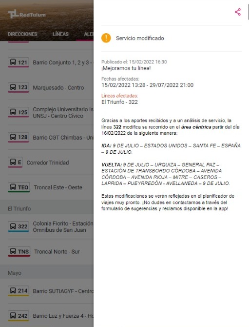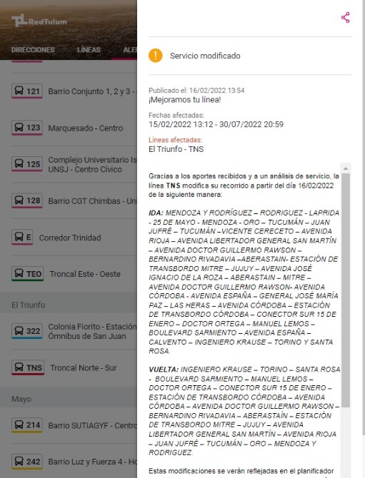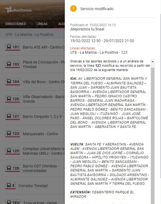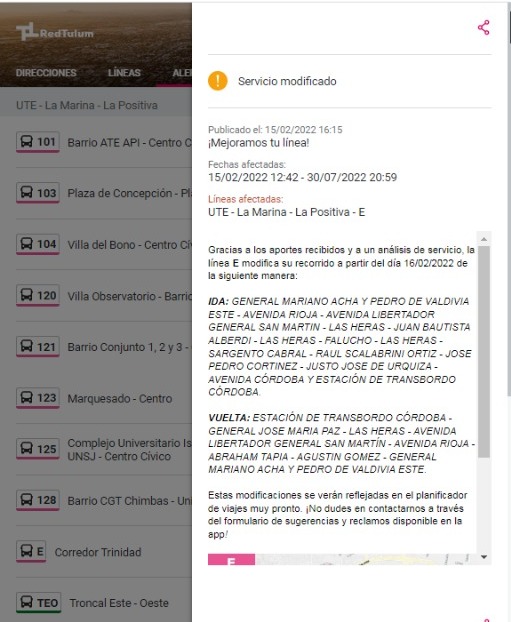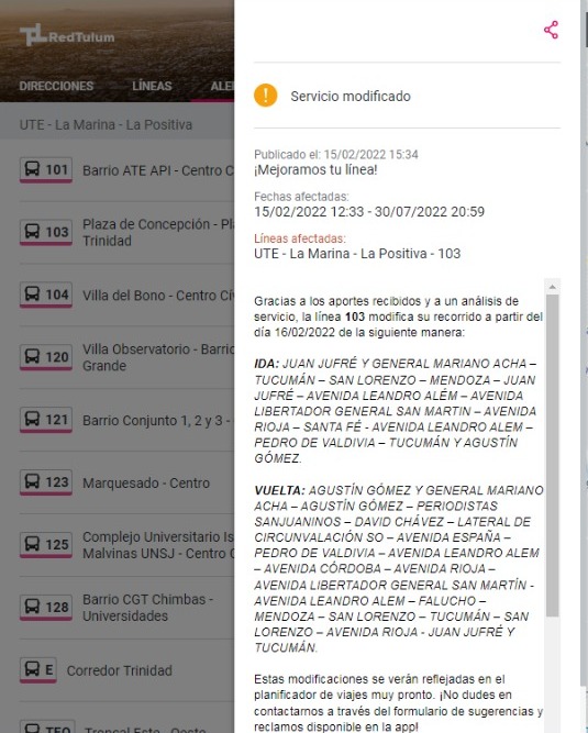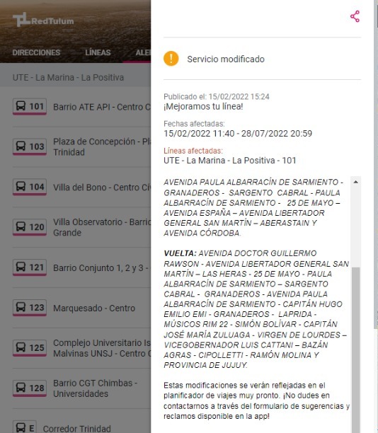 "Gracias al aporte de los usuarios, algunos recorridos se han modificado para mejorar la cobertura", rezaba un cartel en la aplicación que invitaba a hacer click en un enlace para saber el detalle.