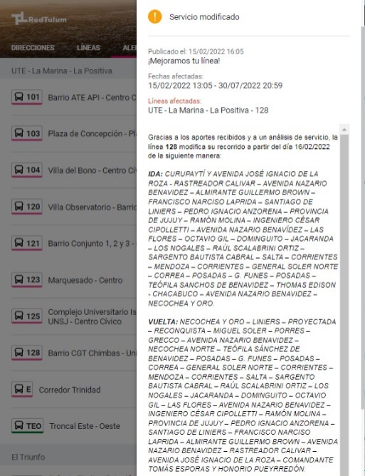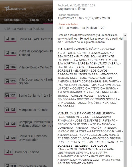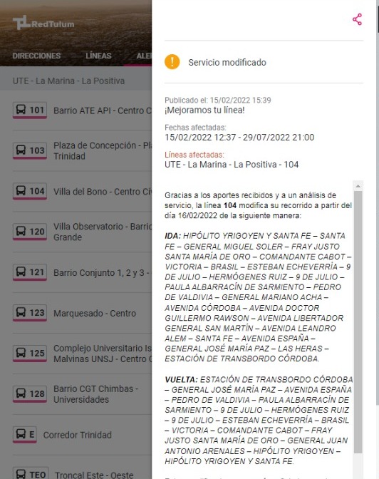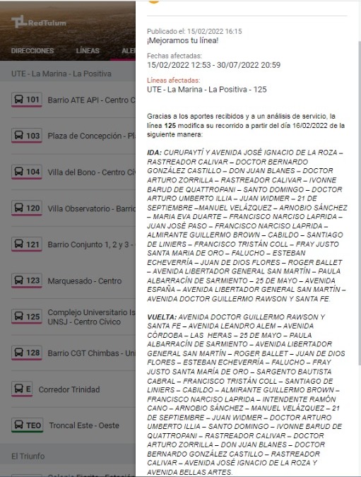 Este miércoles y tras las quejas de varios usuarios, desde la aplicación de la Red Tulum informaron una serie de modificaciones en los recorridos de 10 líneas de colectivos. Mediante el sistema de alerta que tiene la app, indicaron que hubo cambios y dieron a conocer la nueva ruta de cada unidad.