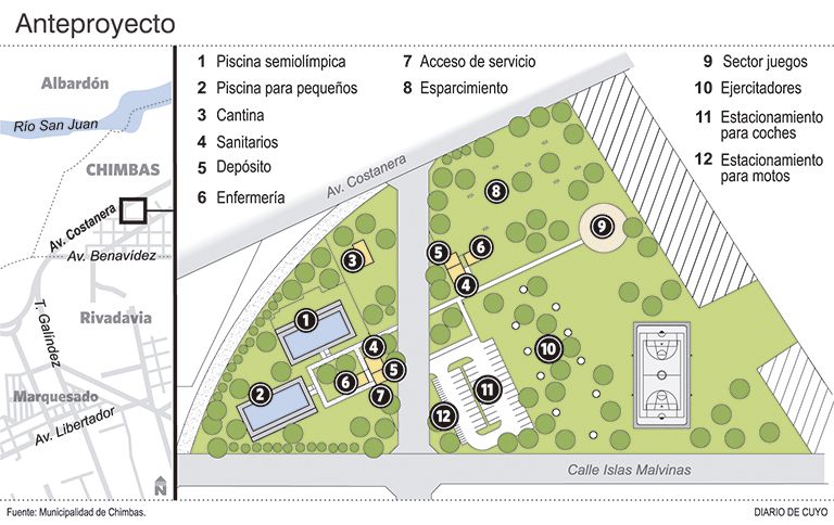 Según el proyecto, que aún no tiene fechas de inicio de obras, el nuevo camping tendrá vestuarios y baños, pues se prevé que ahí funcionen en futuro la colonias de verano pues el lugar tendrá dos piletas (ver infografía).