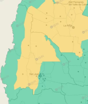 El fenómeno se prevé que impacte este viernes en la tarde-noche en el centro de la provincia, en una franja Norte-Sur, como se aprecia en la imagen. La buena es que, en un principio, no tocaría los departamentos productivos del sureste sanjuanino, tan golpeados por los últimas tormentas. La temperatura máxima no superaría los 31°. Antes, en la mañana, hay probabilidad de chaparrones aislados.